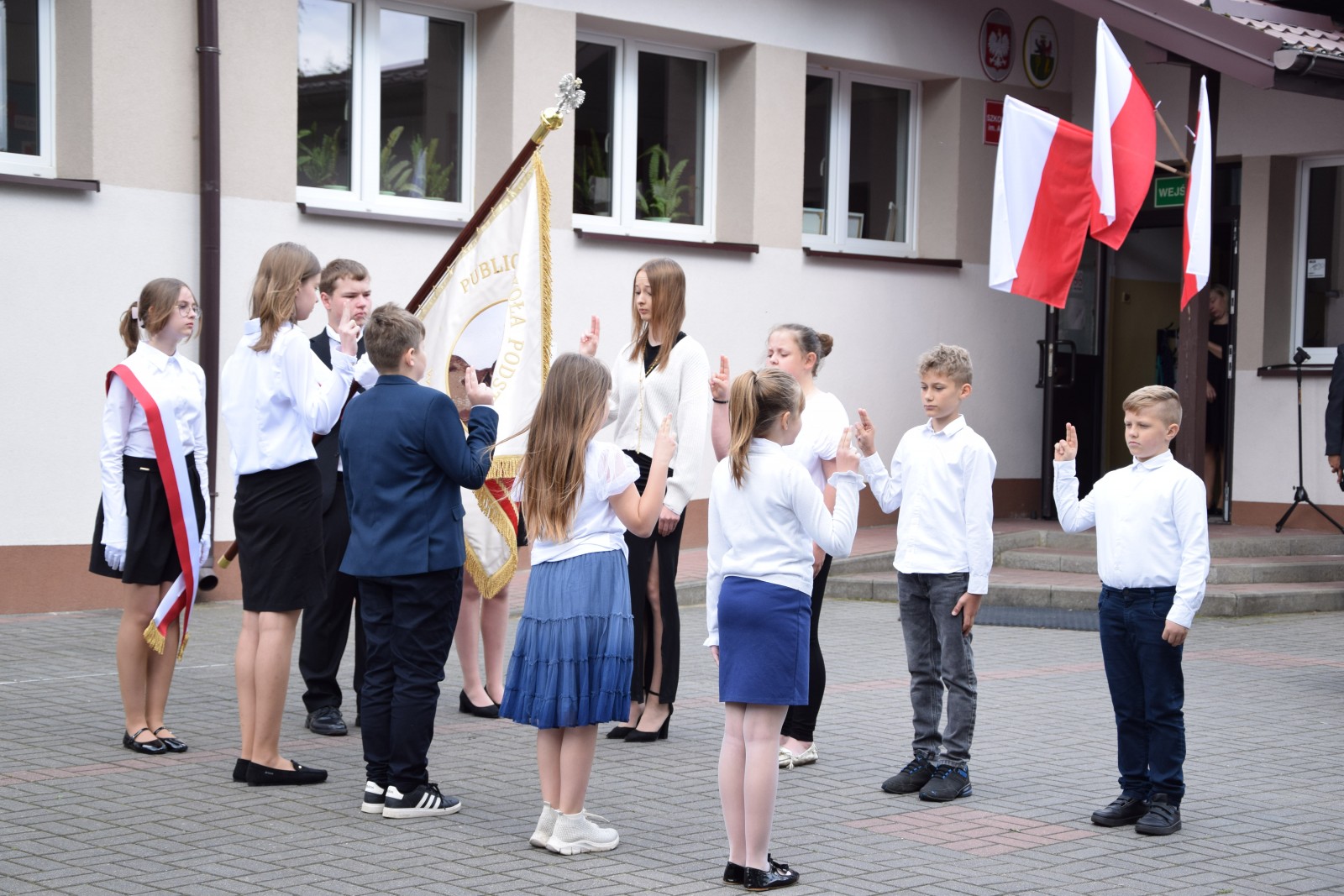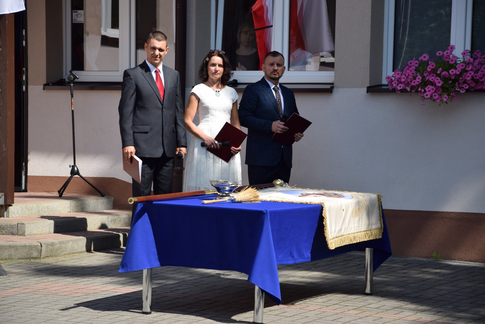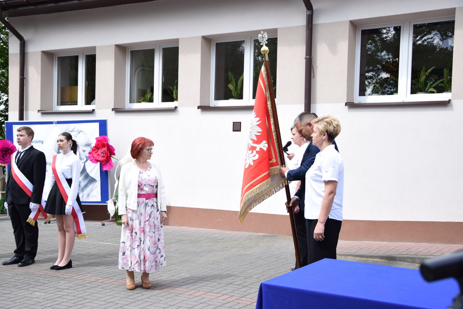 Kolejnym punktem wydarzenia było symboliczne przekazanie sztandaru przez przedstawicieli Rady Rodziców na ręce p. dyrektor Hanny Kukli, która z kolei przekazała sztandar do pocztu. Po oficjalnej prezentacji wybrani uczniowie złożyli ślubowanie na sztandar, obiecując strzec jego honoru i dbać o dobre imię szkoły.