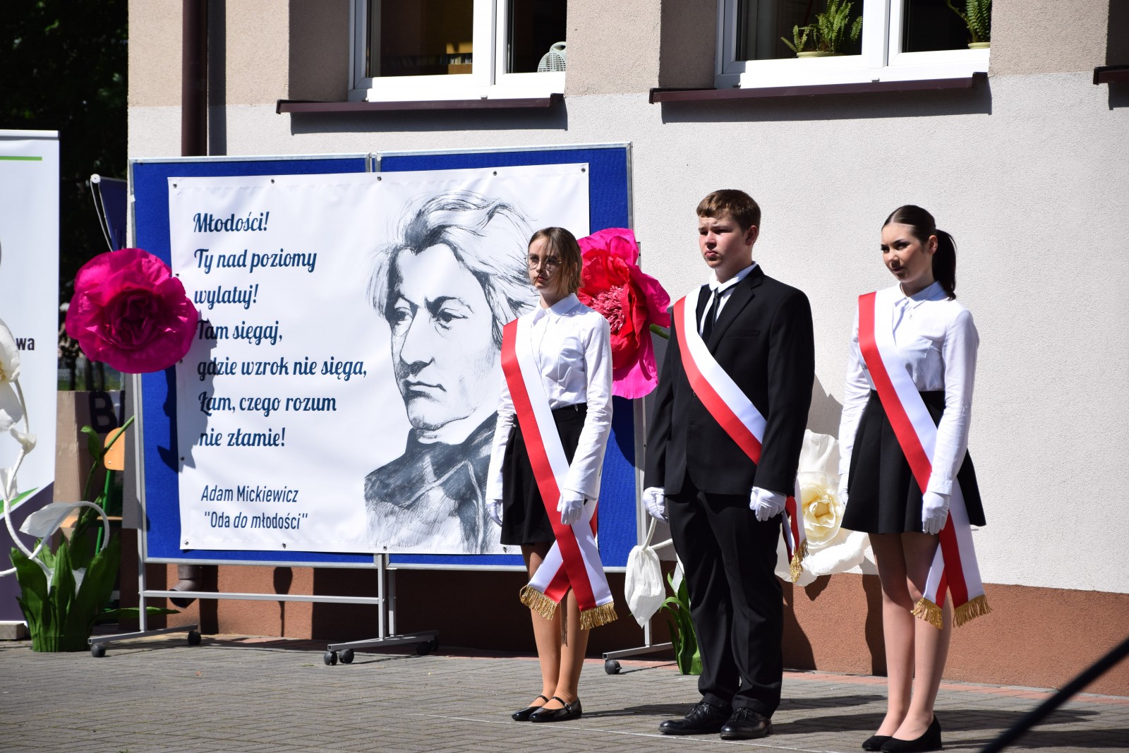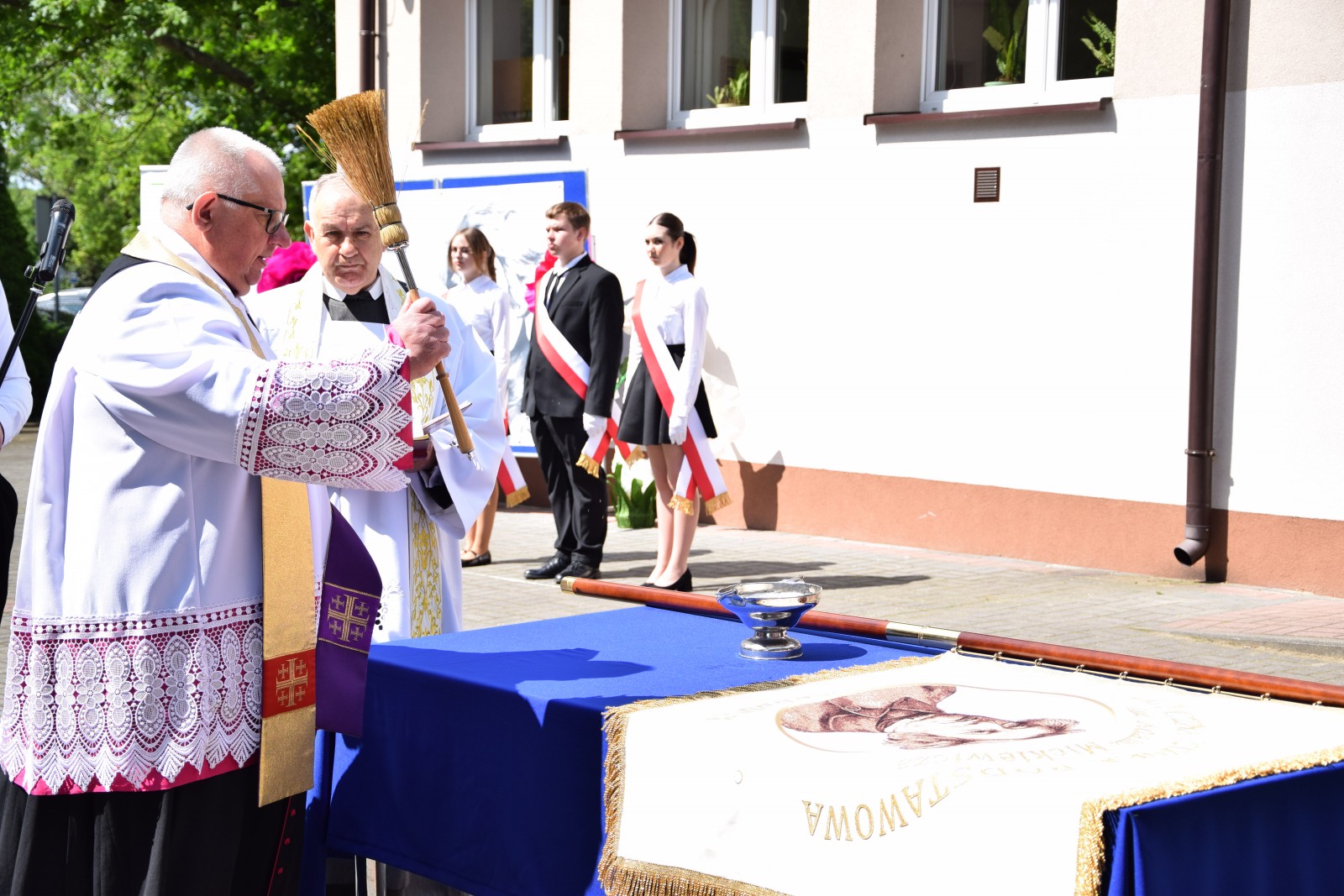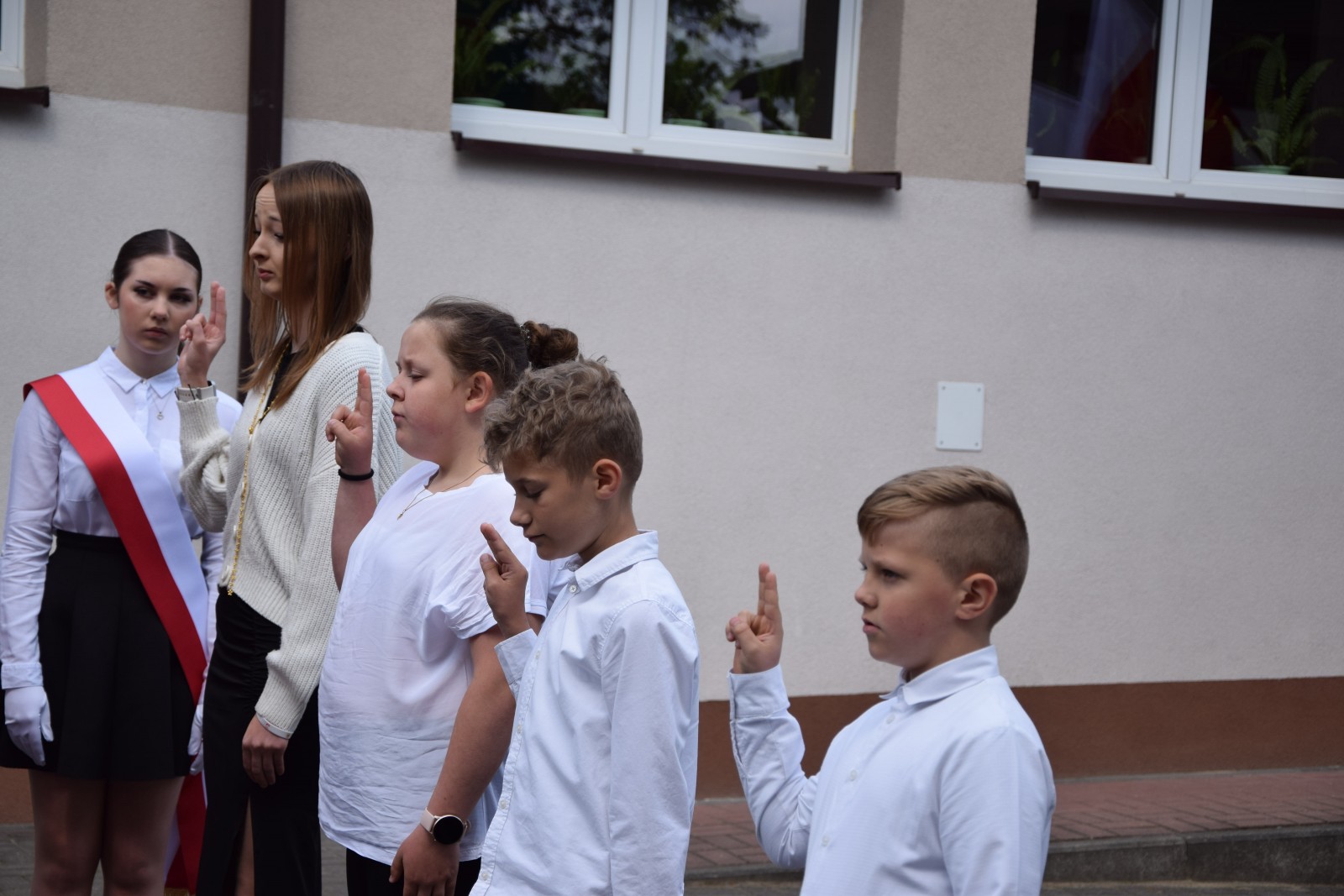 Kolejnym punktem wydarzenia było symboliczne przekazanie sztandaru przez przedstawicieli Rady Rodziców na ręce p. dyrektor Hanny Kukli, która z kolei przekazała sztandar do pocztu. Po oficjalnej prezentacji wybrani uczniowie złożyli ślubowanie na sztandar, obiecując strzec jego honoru i dbać o dobre imię szkoły.