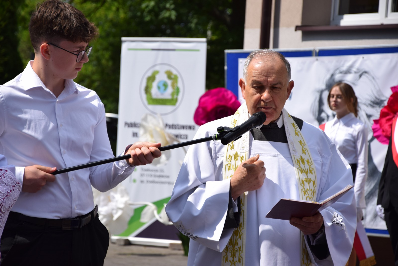 Po uroczystym wprowadzeniu na plac szkolny pocztów sztandarowych przystąpiono do odśpiewania Hymnu Narodowego. Następnie przybyłych gości, nauczycieli, uczniów i rodziców powitali gospodarze wydarzenia: Dyrektor Publicznej Szkoły Podstawowej im. Adama Mickiewicza w Trzebuczy - mgr Hanna Kukla i Wójt Gminy Grębków - Bogdan Doliński. W dalszej częsci uroczystości Przewodniczący Rady Gminy Grębków - Ireneusz Kowalski odczytał treść uchwały nadającej szkole patrona a przedstawiciele duchowieństwa, w tym proboszcz Parafii św. Bartłomieja Apostoła w Grębkowie - Ks. Kanonik mgr Marek Zalewski i proboszcz Parafii Przemienienia Pańskiego w Żarnówce - Ks. Tadeusz Ratajczyk dokonali poświecenia nowego sztandaru. Zgromadzeni odśpiewali też nowy hymn szkoły, który powstał specjalnie na tę uroczystość.